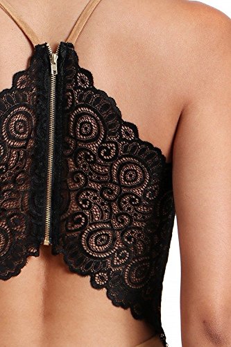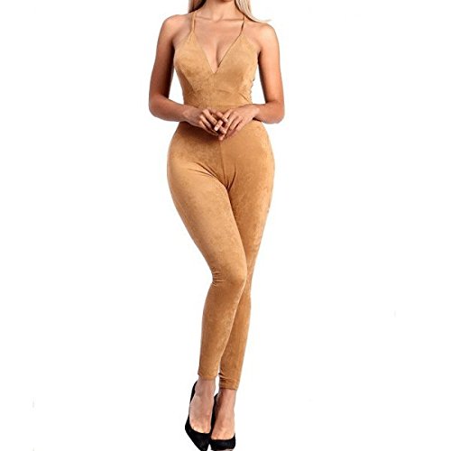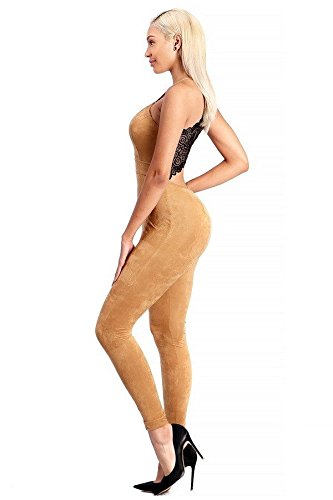 Spaghetti strap soft suede jumpsuit with lace patterned see-through back. Zipper to secure. Content: 97% Polyester 3%Spandex