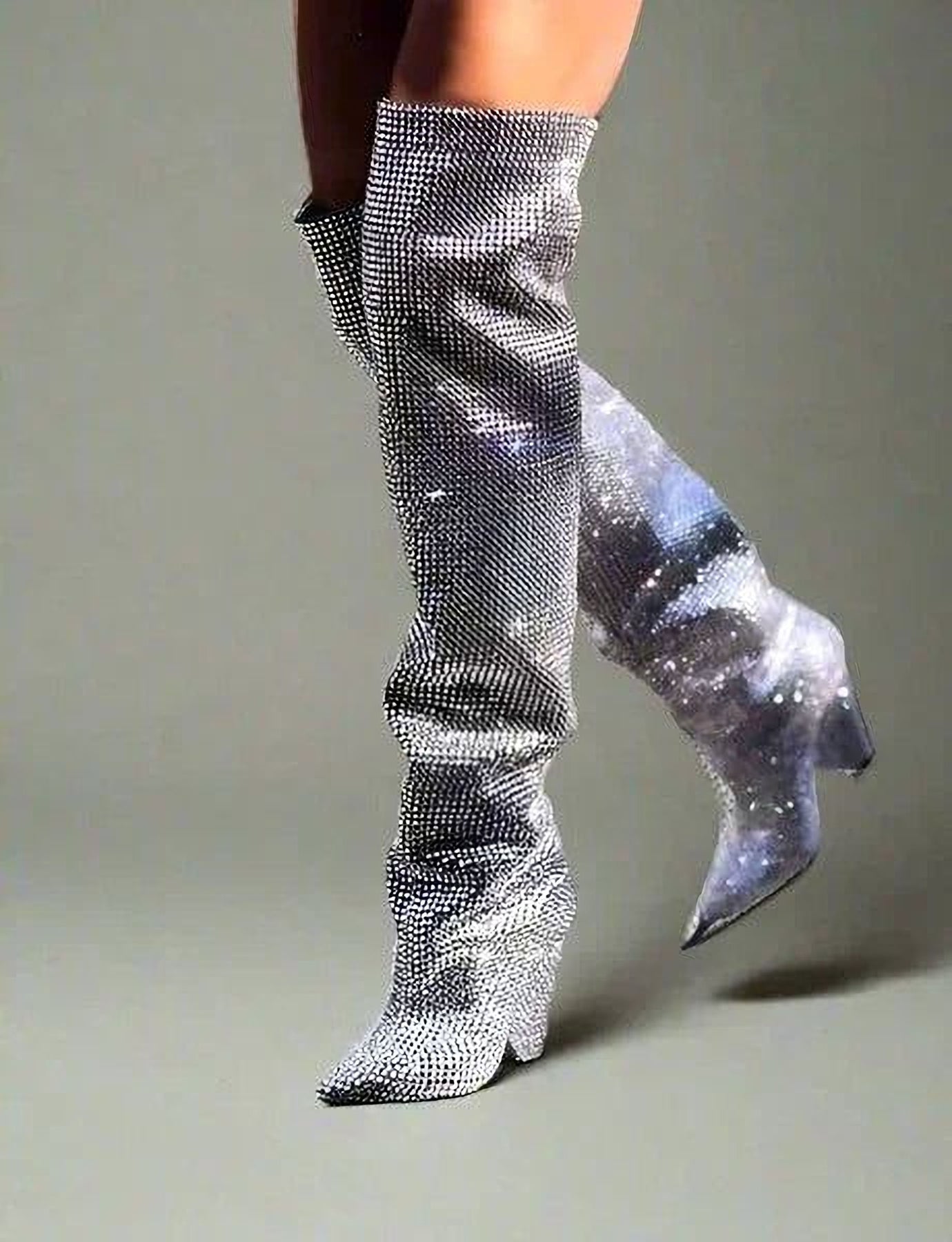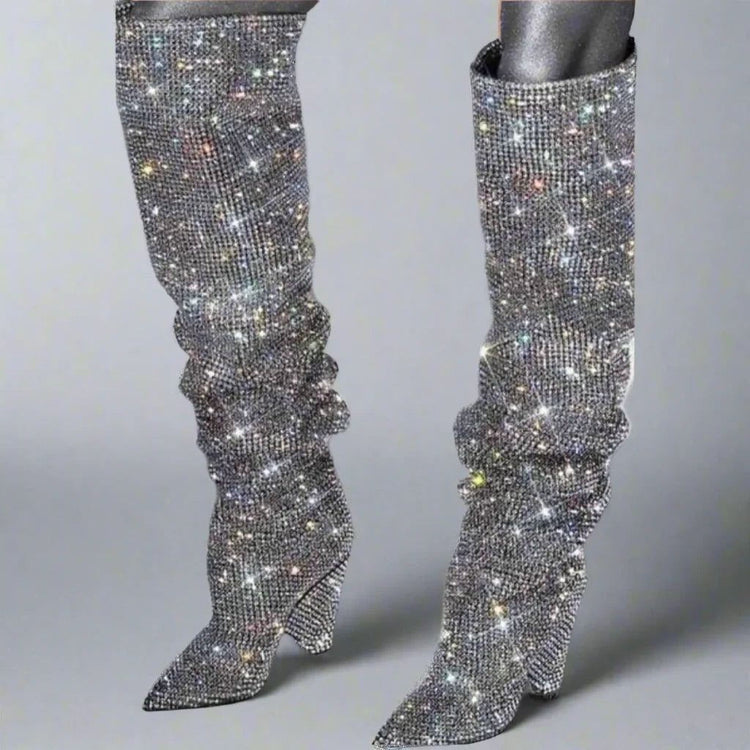 Knee-high silver rhinestone boots with pointed toe and high slouchy heel, sparkling effect