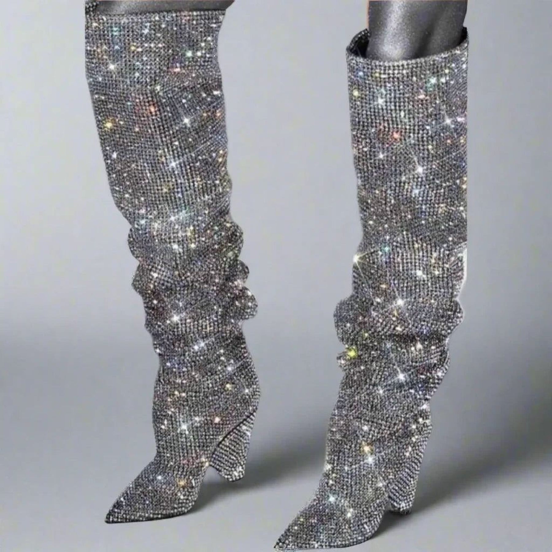Tall slouchy rhinestone crystal boots with pointed toes, perfect for evening wear or club outfits