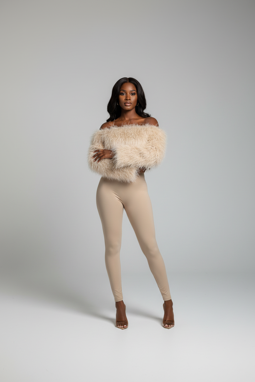 The off-shoulder crop top features bold fur trim that adds texture and luxury, perfectly paired with sleek high-waisted leggings that accentuate your shape. Whether you’re headed to the club, a special event, or a glamorous night out, this set is your ticket to unforgettable style.