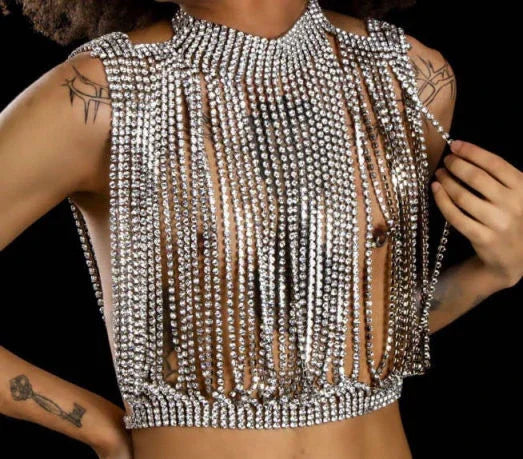 Introducing the Rhinestone Mock Neck Chain Shirt, a unique and stylish piece of apparel that is ready to ship. This shirt features a full rhinestone chain on the front and back, making it a truly eye-catching piece. It is available in both silver and gold, with silver taking one business day to process and gold taking three.