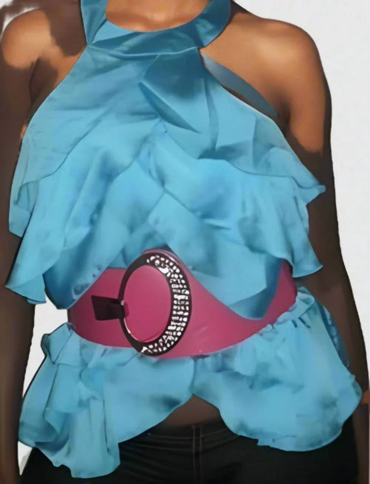 Halter round neckline top with asymmetrical layered ruffled- Prima Dons and Donn