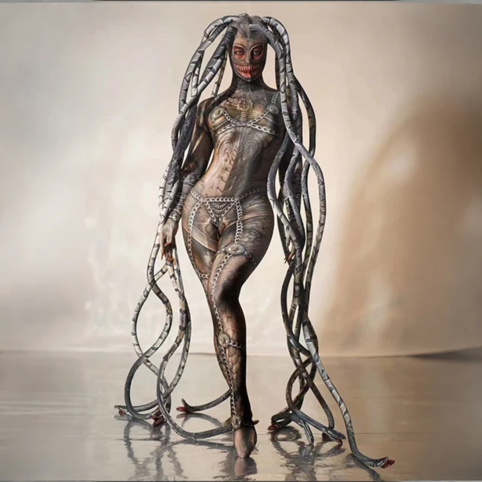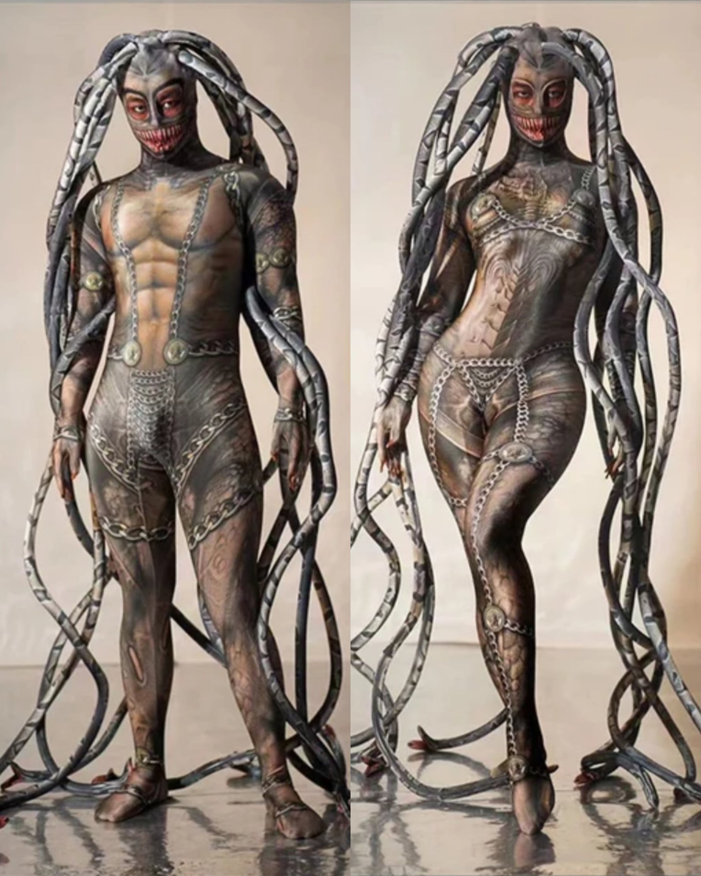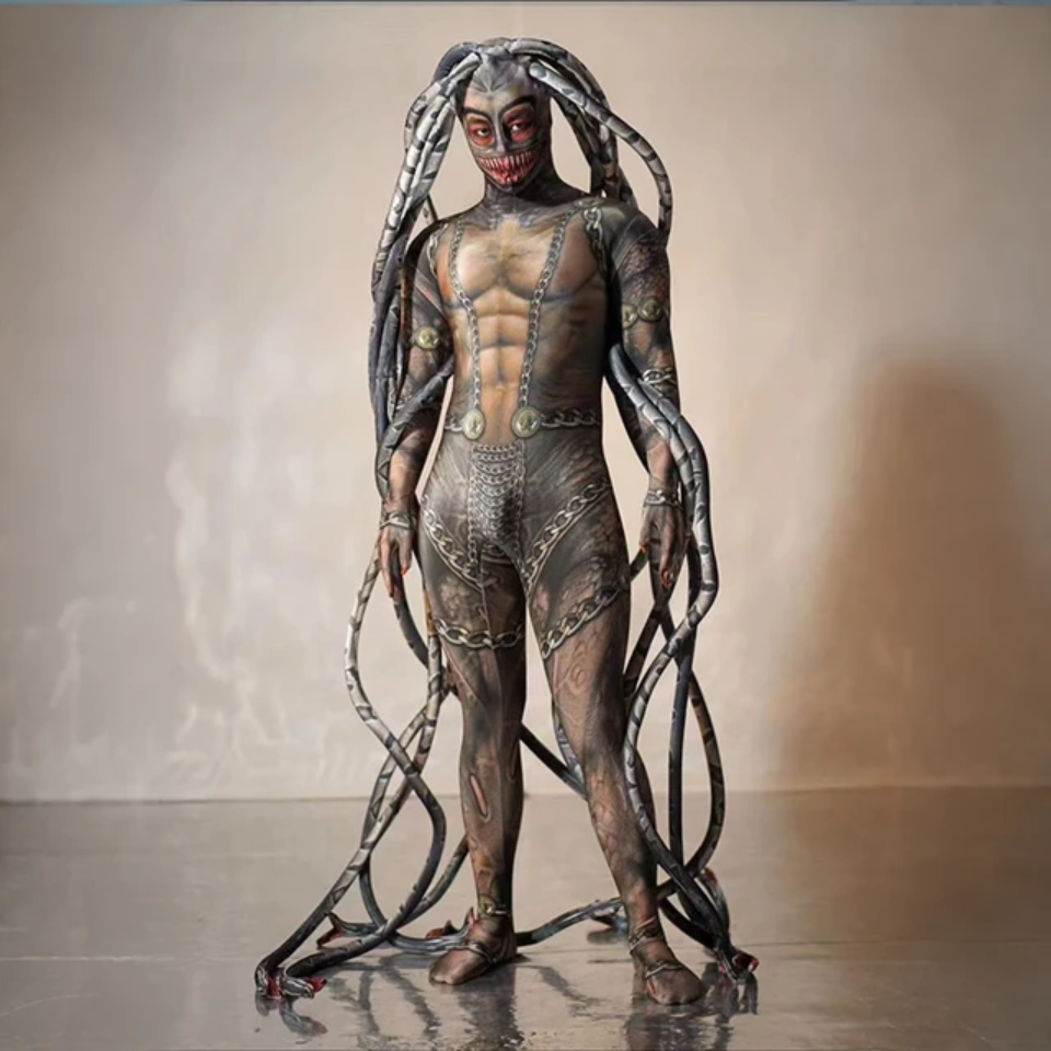 * Flowing Tentacles: Attached to the costume are multiple long, flowing tentacles that mimic the octopus's graceful yet menacing movements. These tentacles add an extra dimension of creepiness as they sway and writhe with every step.