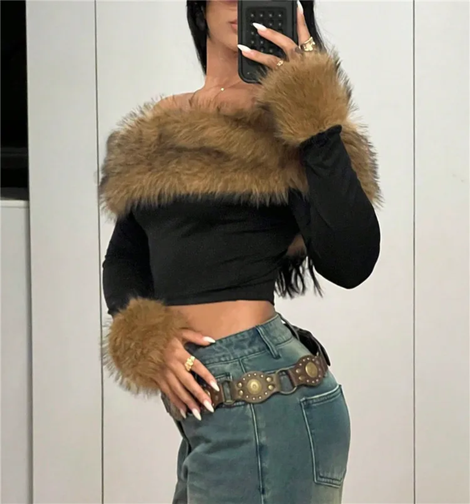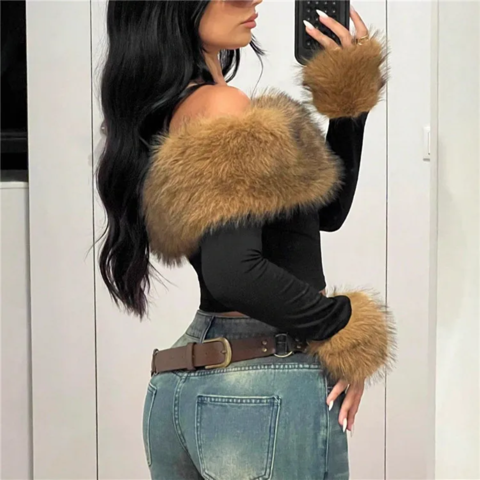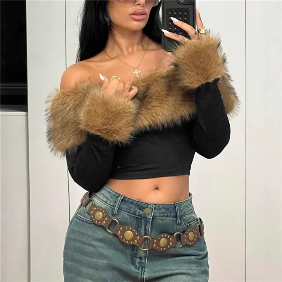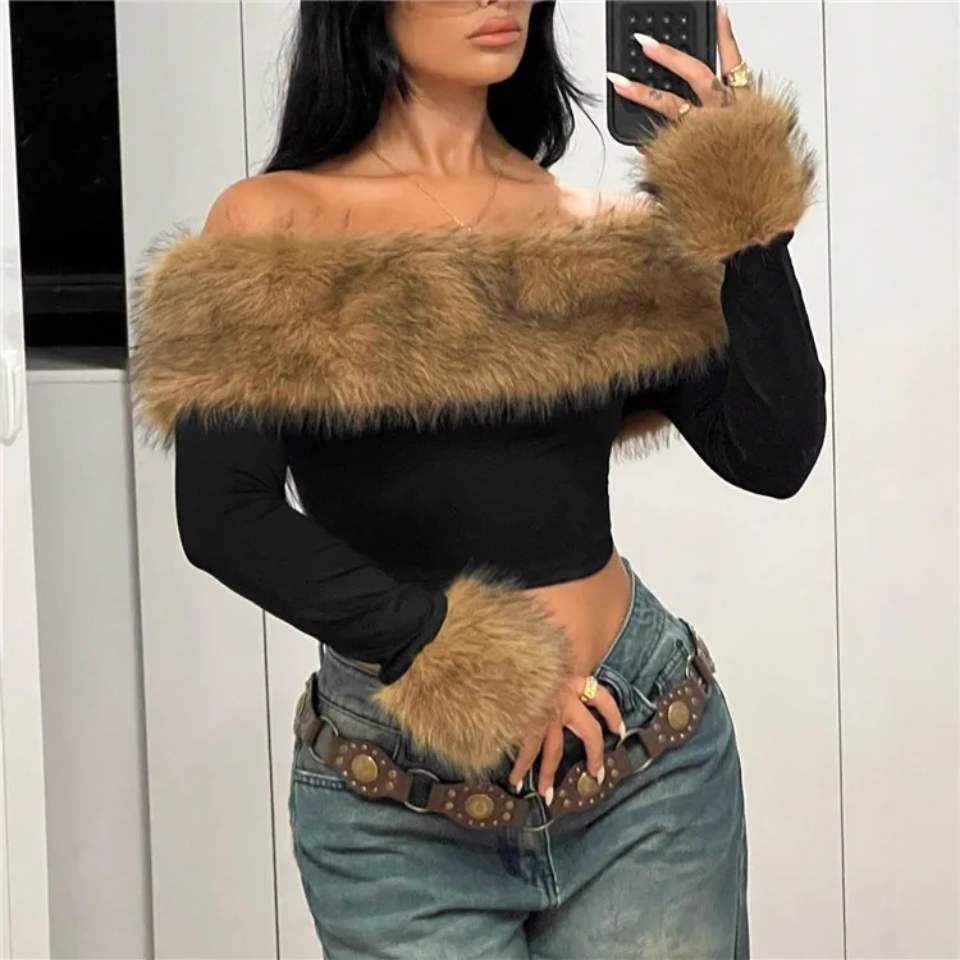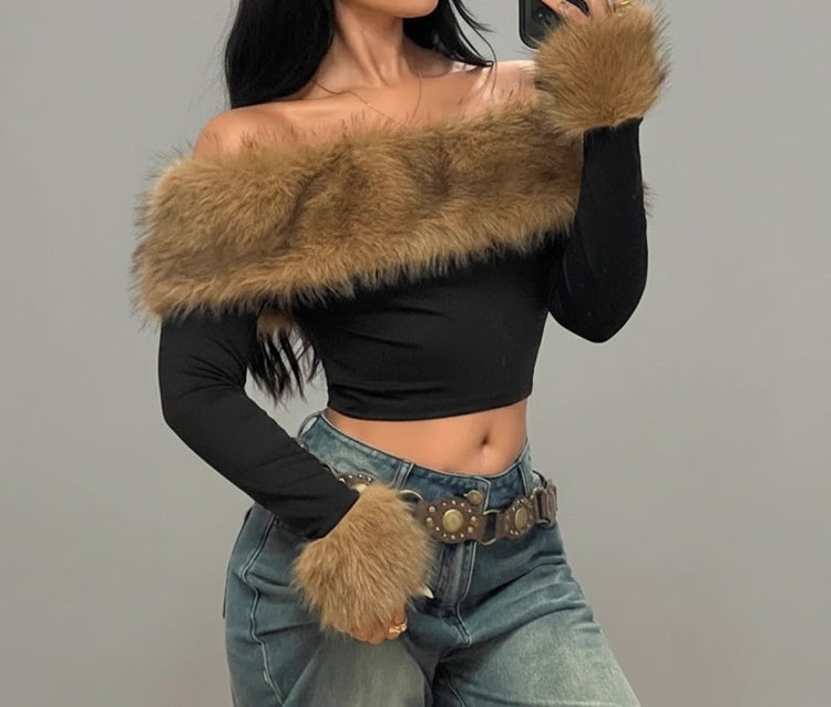 Faux Fur Off Shoulder Long Sleeve Top 1- Prima Dons and Donnas