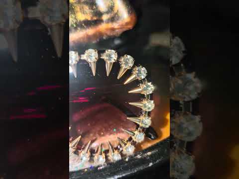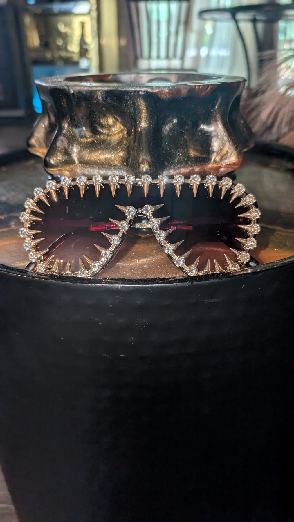 Hand holding oversized sunglasses with dark lenses, gold spikes, and crystal rhinestone trim