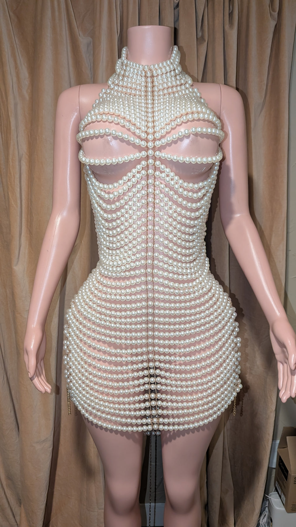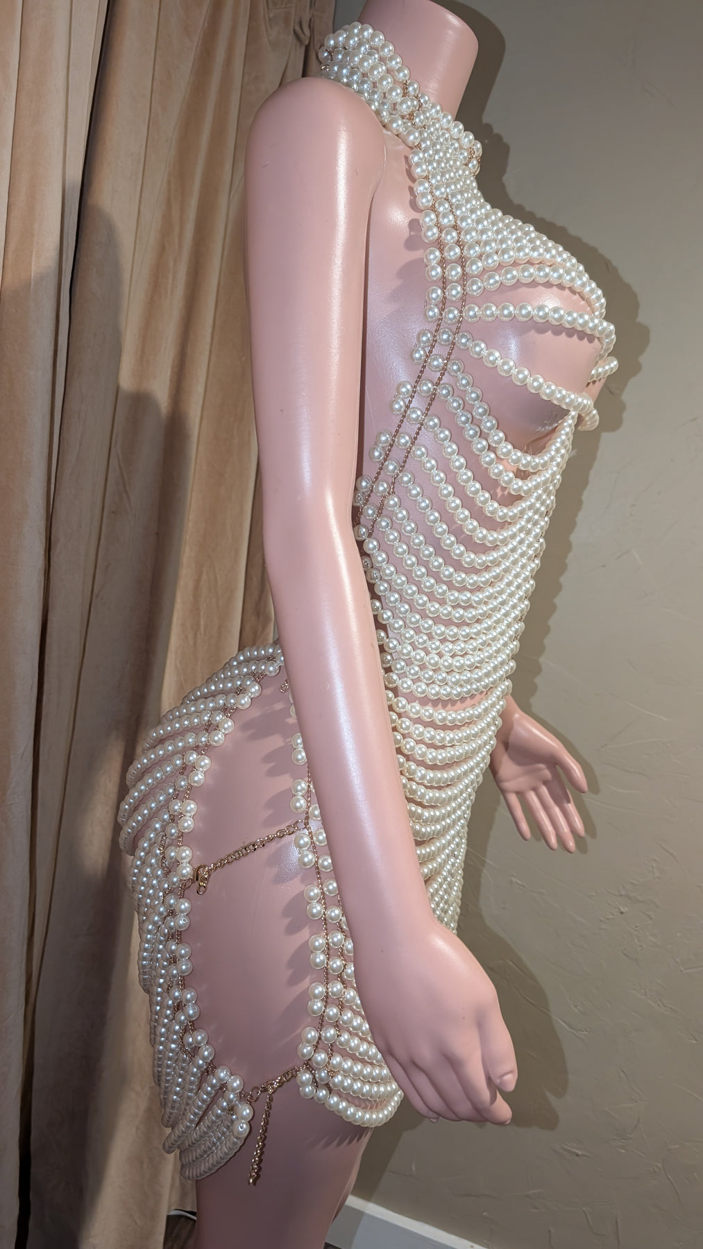 Unique mini dress made from multiple layers of gold chains and white pearls that form a high neckline and a short skirt with hanging pearl strands.