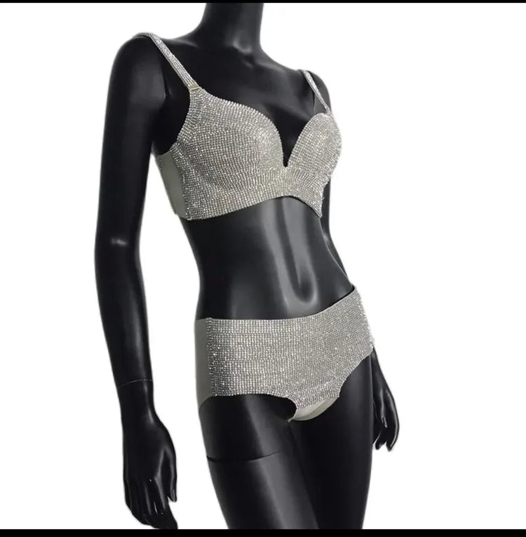 This custom rhinestone bra set from Prima Dons and Donnas is made to order and takes around 7 business days to ship out. It features small stones on the breast and a rhinestone design on the bottom. Please pay attention to sizing as it RUNS SMALL. For plus size, please provide your measurements in CM for bust, waist, and hips.
