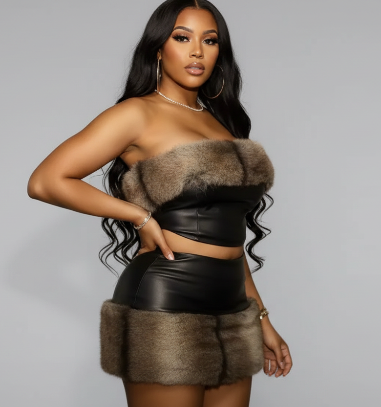Tube Two Piece Faux Fur Winter Mini rhinestone Skirt Set- By Prima DND