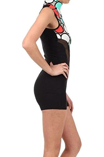 44% polyester 30% rayon 23% nylon 3% spandex small bust 26" waist 24" hip 30" length 30" medium bust 28" waist 26" hips 32" length 30" large bust 30" waist 28 hips 34" length 31" features mesh inserts back zipper turtle neck